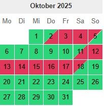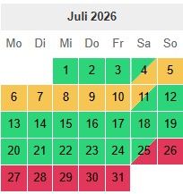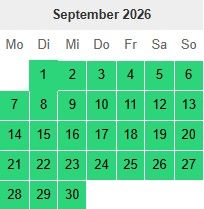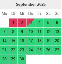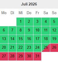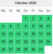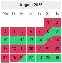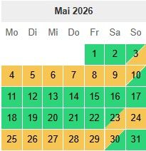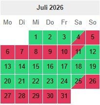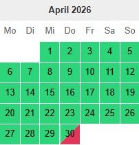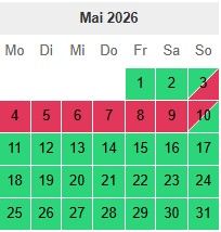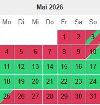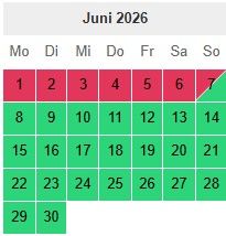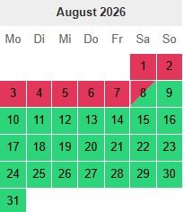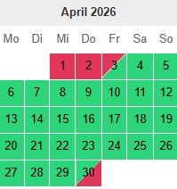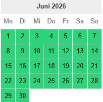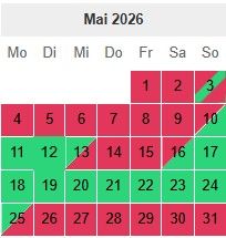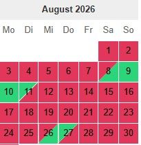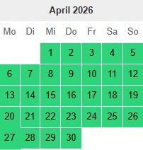 Hier habt Ihr unseren Buchungskalender. Hier könnt ihr die belegten und die freien Tage sehen. Bei Fragen einfach melden.